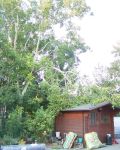 Ein durch den starken Wind abgebrochener Ast ist auf ein Gartenhaus gestürzt.