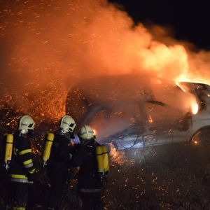 Den letzten Programmpunkt des Abends stellten zwei brennende Fahrzeuge dar. Am Schauplatz eingetroffen, galt es aus beiden Feuerwehrfahrzeugen eine Löschleitung aufzubauen, um die Flammen unter Kontrolle zu bringen.