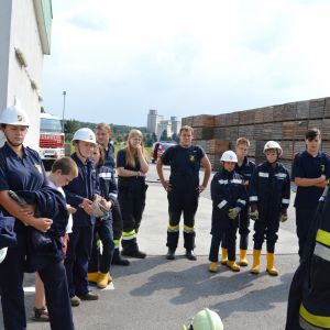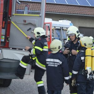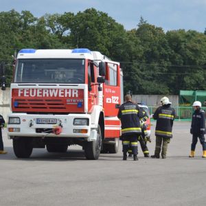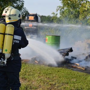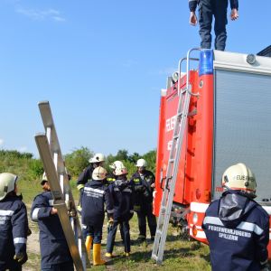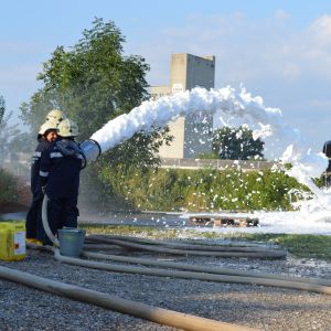 Später war die Übungsannahme der Brand eines kleinen Gebwerbebetriebes in Oberolberndorf, bei dem auch ein Dieseltank und ein Fass mit brennbarer Flüssigkeit betroffen waren. Dabei mussten die Mädchen und Buben den Brand löschen und die brennbare Flüssigkeit mit einem Schaumteppich bedecken.