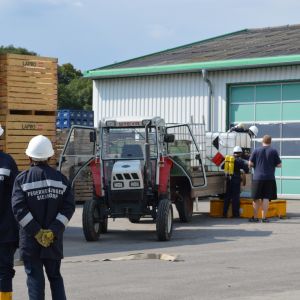 Als erstes war ein Schadstoffunfall nachgestellt. Eine verletzte Person musste gerettet werden und der undichte Behälter musste abgedichtet werden.