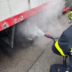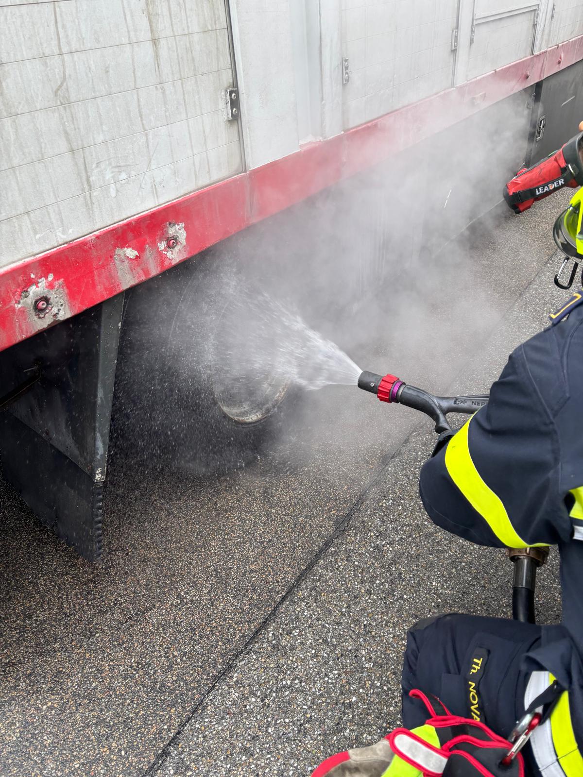 Nach Absicherung der Einsatzstelle wurde das Rad mittels HD-Rohr vom RLFA-2000 abgekühlt.