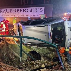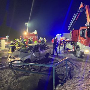 Ein PKW kam vermutlich aufgrund der eisglatten Fahrbahn von der Strasse ab und krachte mit der Fahrerseite in das Geländer eines Wassergrabens. Der PKW blieb seitlich auf der Fahrerseite am Geländer in ca. 2m Höhe über dem Wassergraben hängen, die Fahrerin blieb nahezu unverletzt, konnte sich aber nicht selbst befreien.