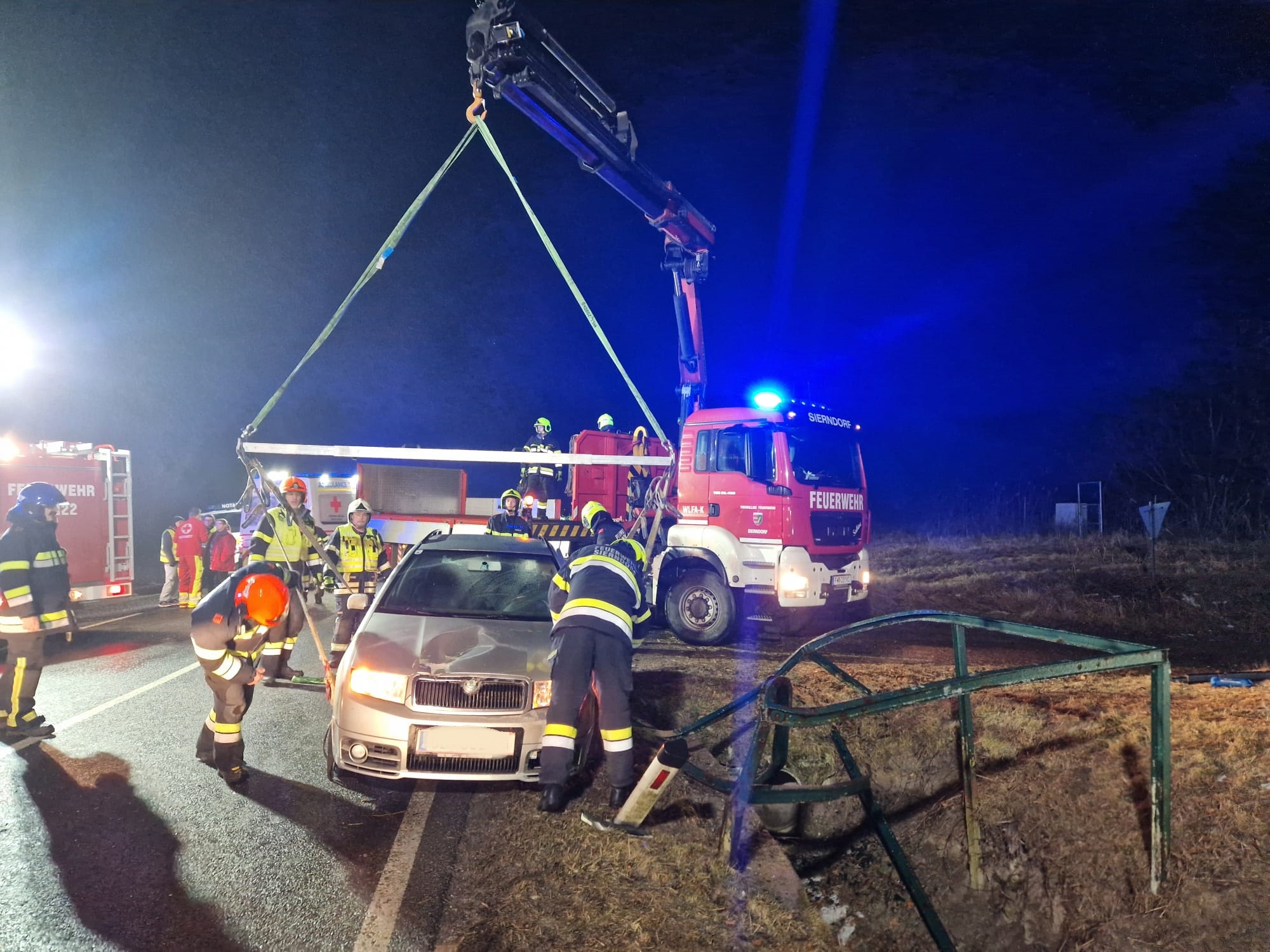 Die ersteintreffende FF Untermallebarn sicherte den PKW mit Runschlingen und Spanngurten am KLFW Untermallbarn. Nach Eintreffen des VRF und WLFA-K Sierndorf wurden mit dem Einsatzleiter und dem Rettungsdienst die weiteren Schritte besprochen.