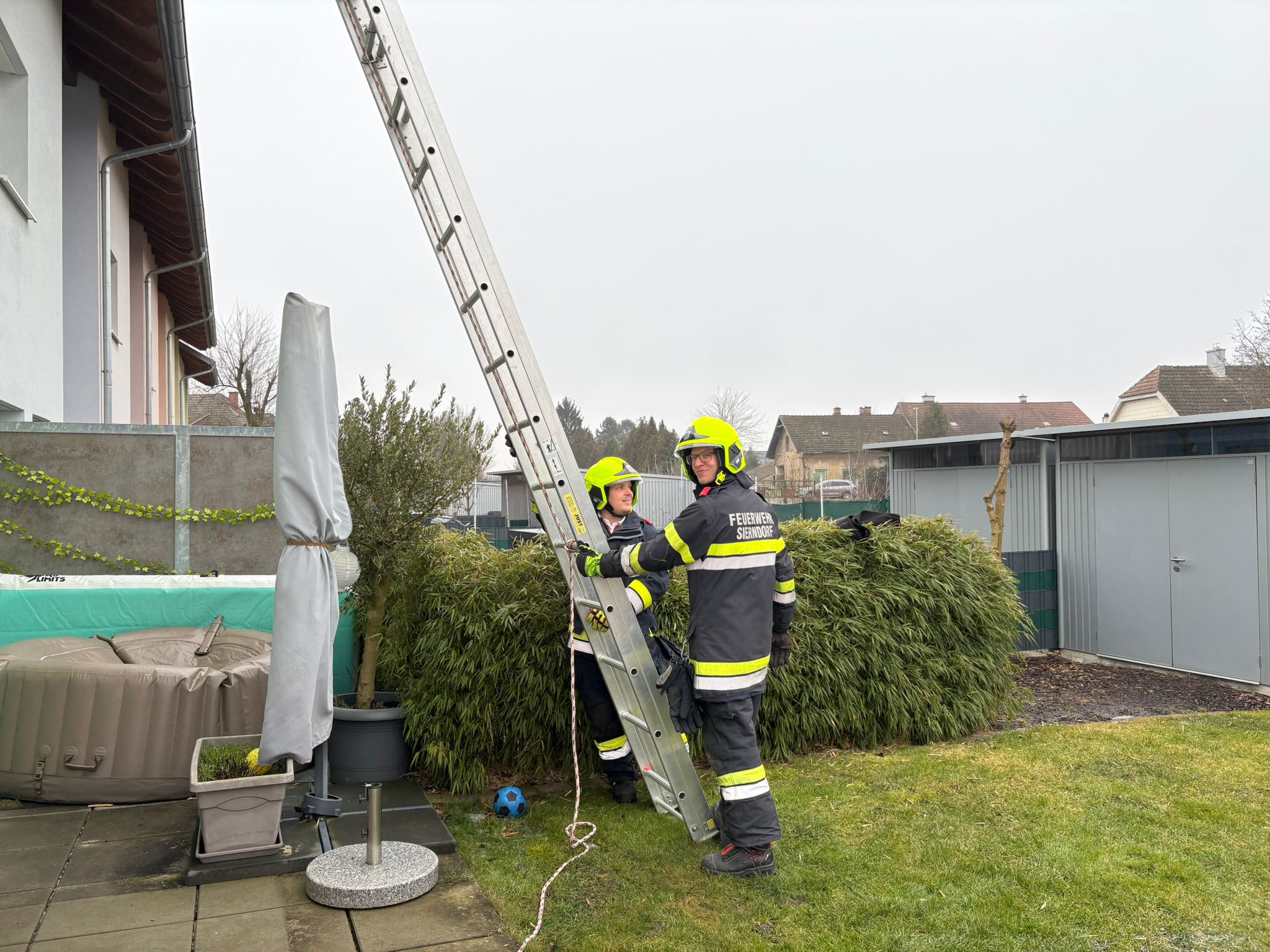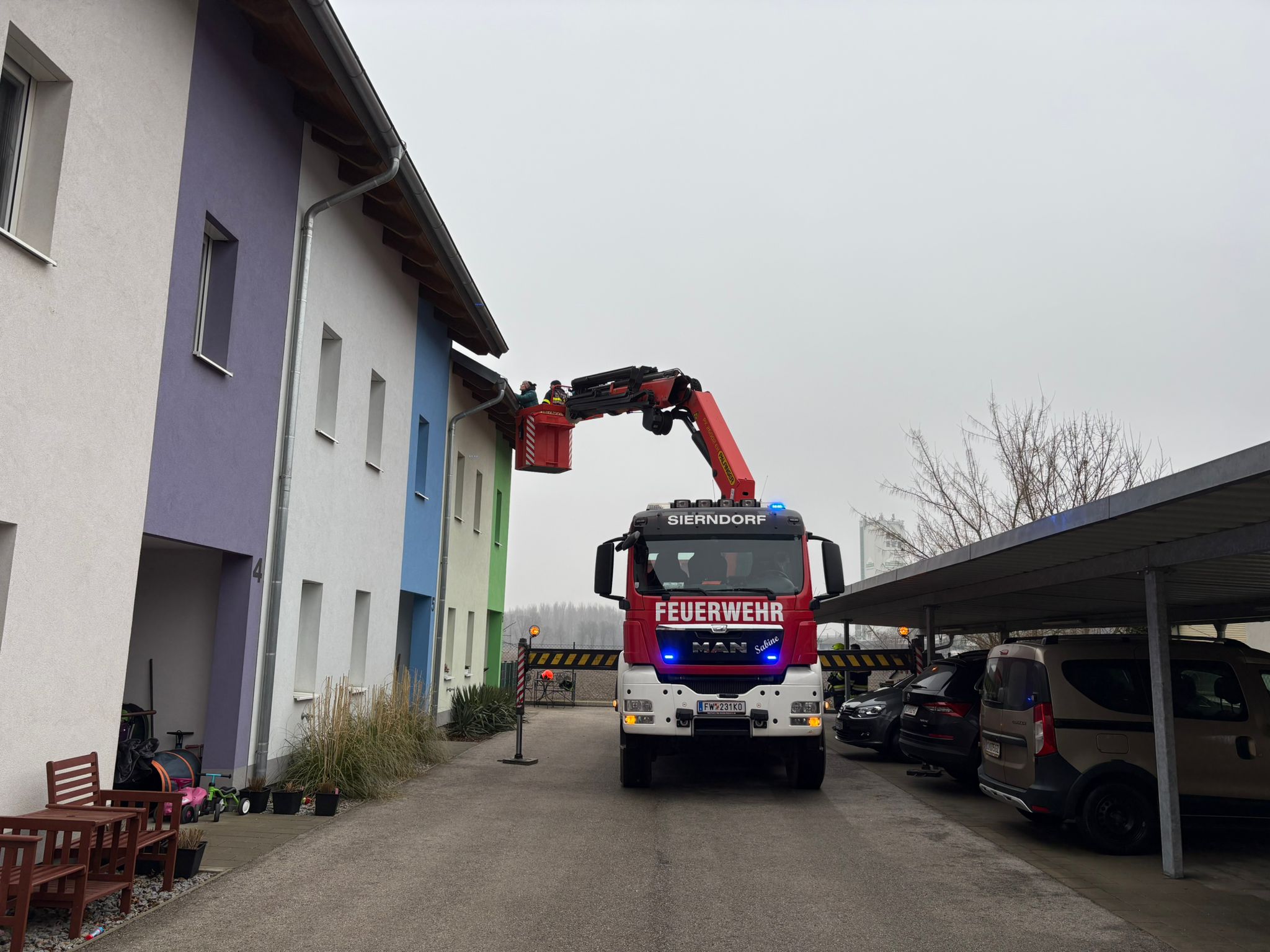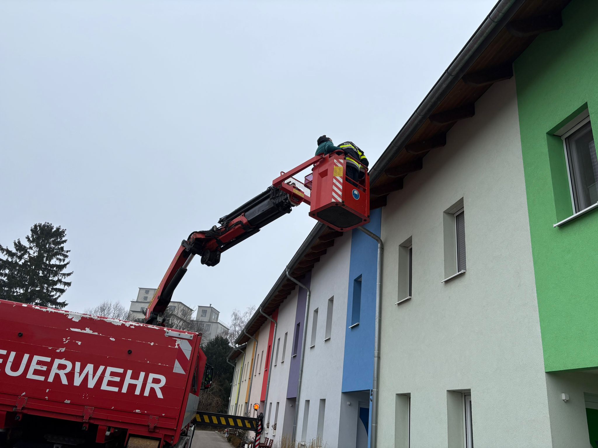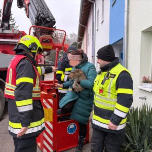 Ein Kamerad stieg mittels Schiebeleiter auf der einen Dachseite hoch und konnte den Vierbeiner auf die andere Seite des Daches treiben, wo ihn die Besitzerin und ein Kamerad im Arbeitskorb des WLFA-K einfangen konnten.