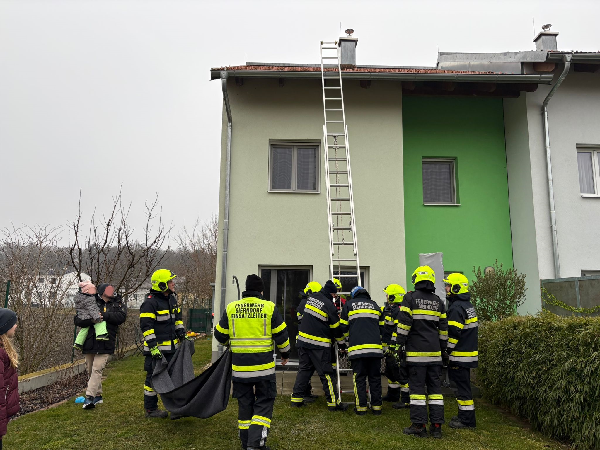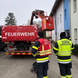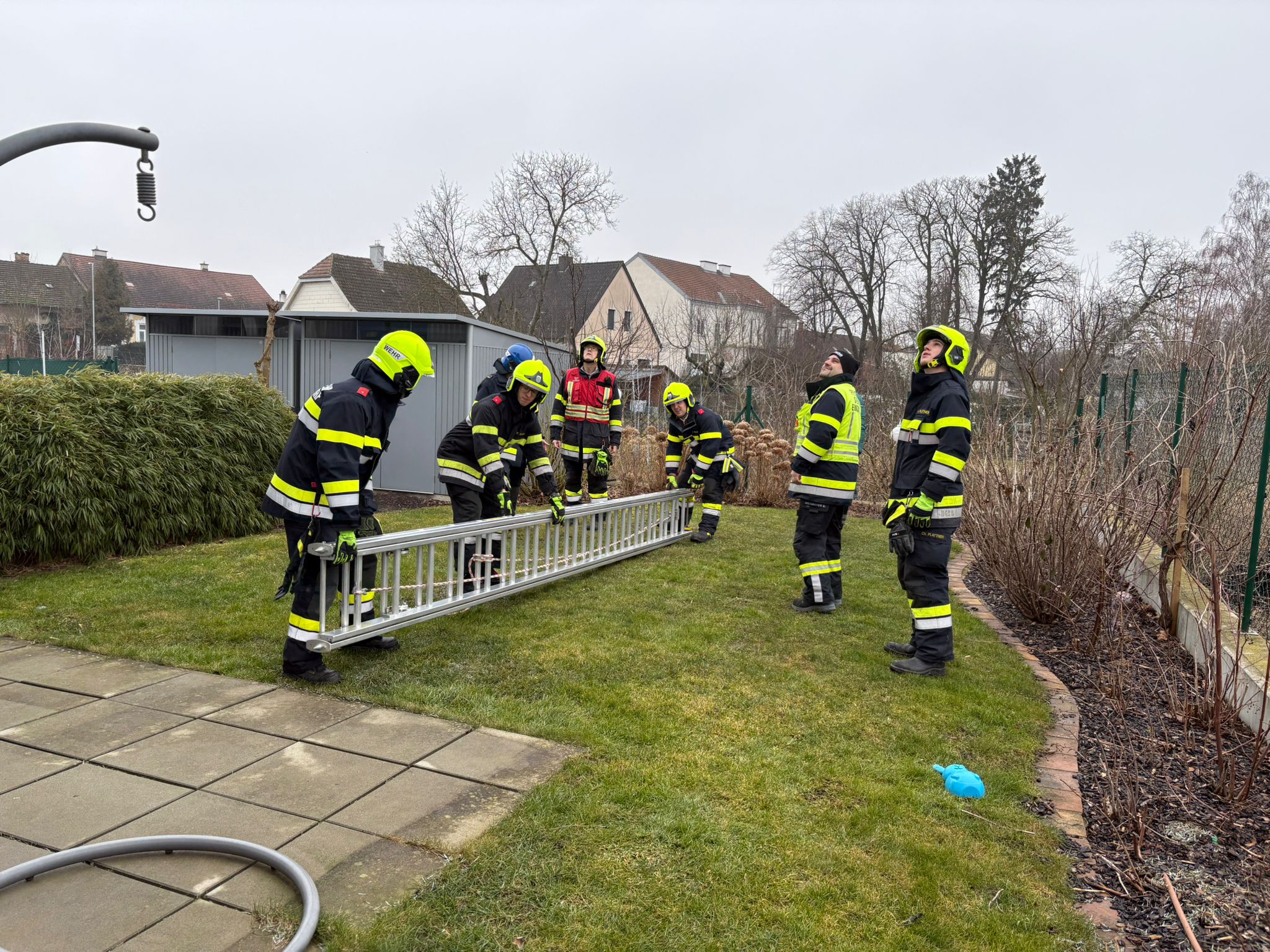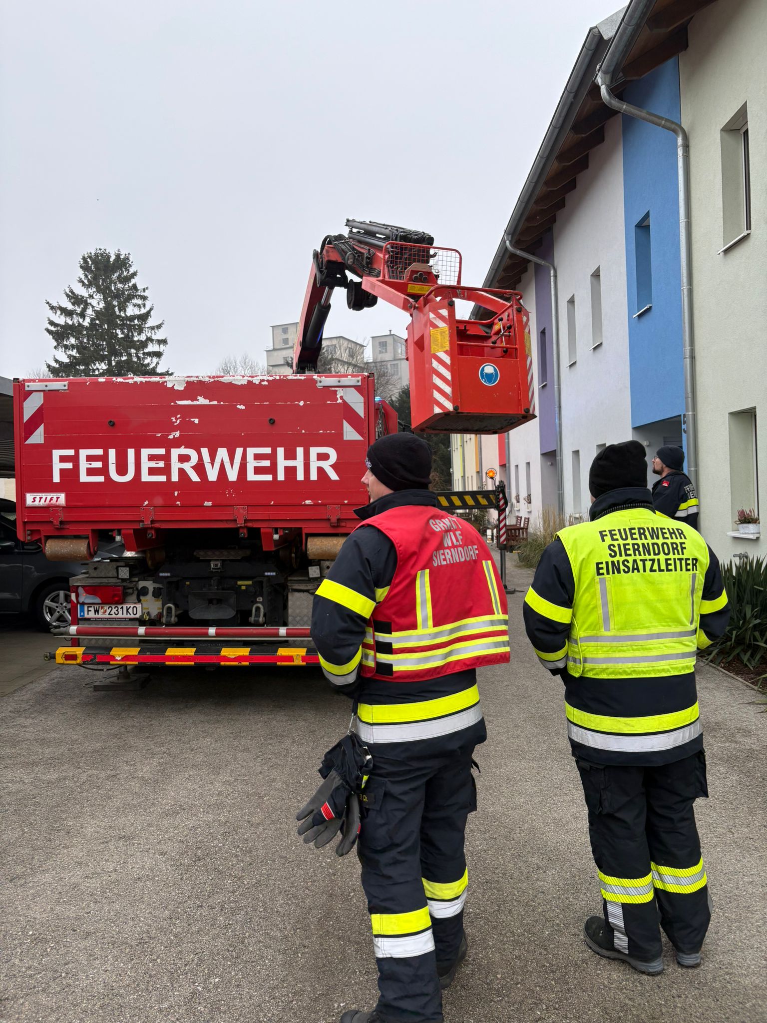Ein Kamerad stieg mittels Schiebeleiter auf der einen Dachseite hoch und konnte den Vierbeiner auf die andere Seite des Daches treiben, wo ihn die Besitzerin und ein Kamerad im Arbeitskorb des WLFA-K einfangen konnten.