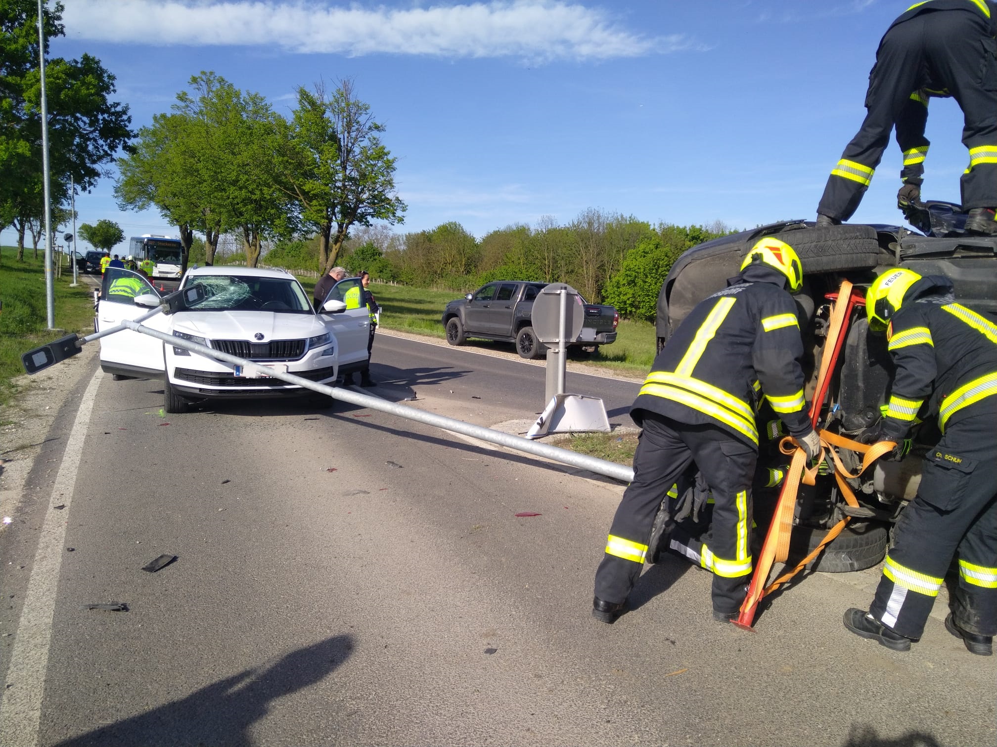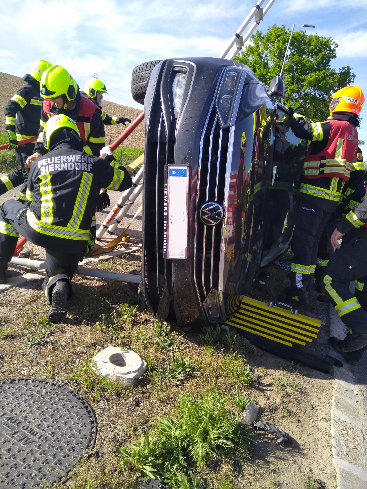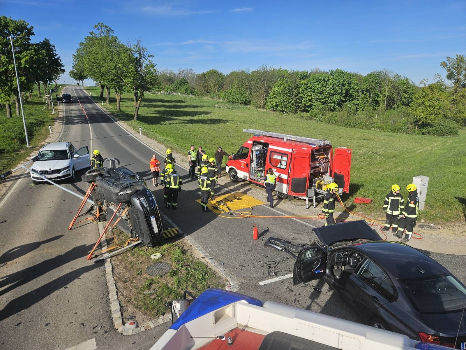 Bei unserem Eintreffen war die Fahrerin des BMW bereits aus dem Fahrzeug und wurde von Ersthelfern betreut. Der Fahrer des VW konnte sich nicht selbst aus dem Fahrzeug befreien. Nach Stabilisierung des Fahrzeuges wurde mit dem hydraulischen Spreizer die hintere Türe geöffnet um einen Zugang für einen Kameraden zur Betreuung des Lenkers zu schaffen. Anschließend wurde die vordere Tür geöffnet, der Fahrer konnte dann mit etwas Hilfe das Fahrzeug verlassen.