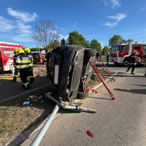 Aus unbekannter Ursache kolliderten zwei PKW, der BMW kam schwer beschädigt im Kreisverkehr zu stehen, der VW schleuderte gegen eine Strassenlaterne und blieb auf der Fahrerseite liegen. Die Laterne stürzte anschließend auf einen weiteren PKW.