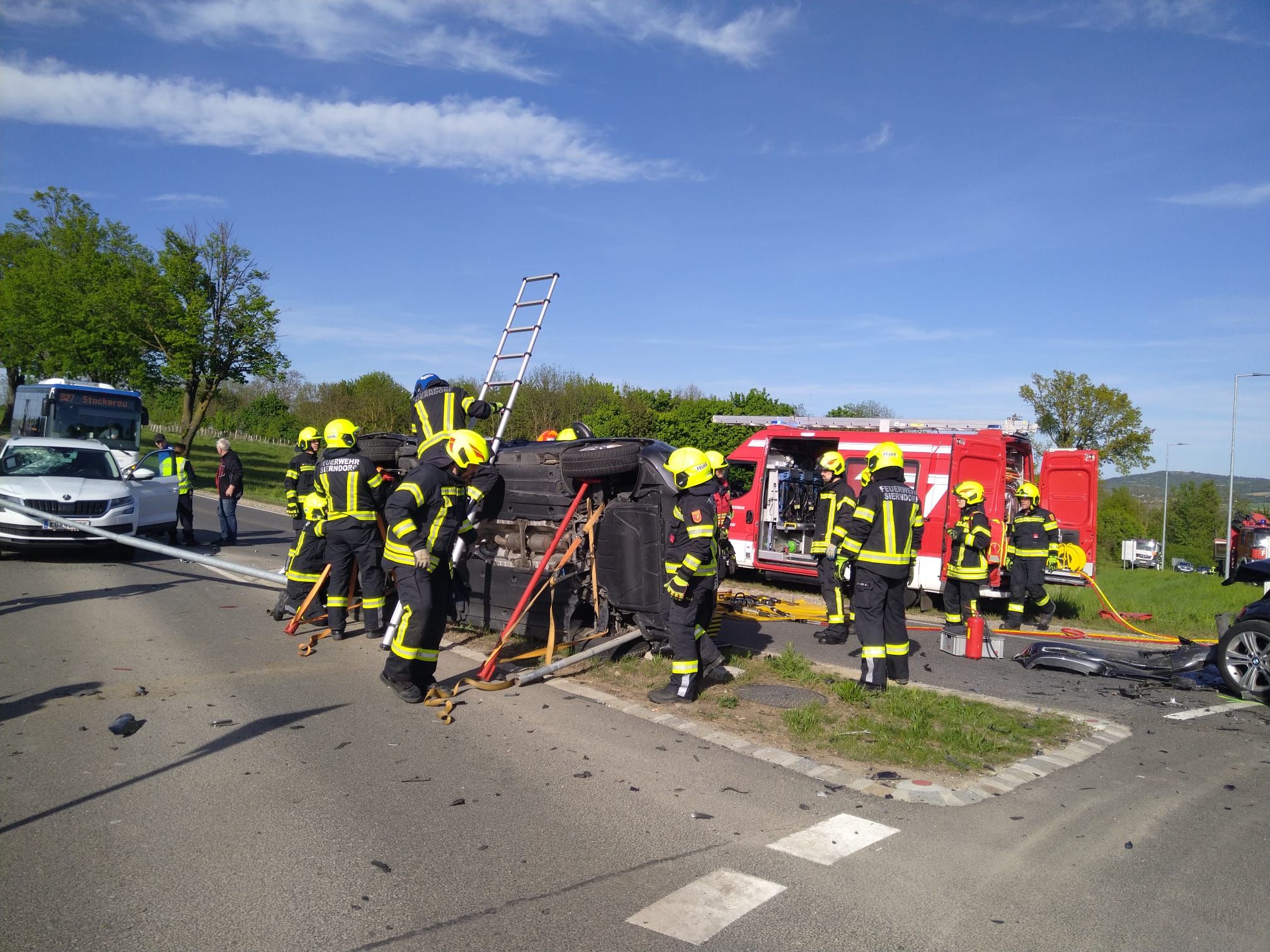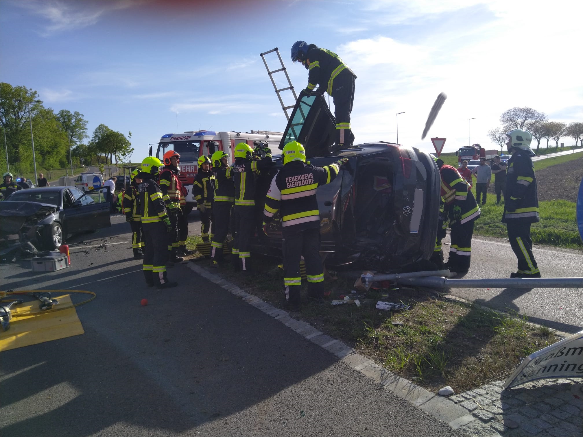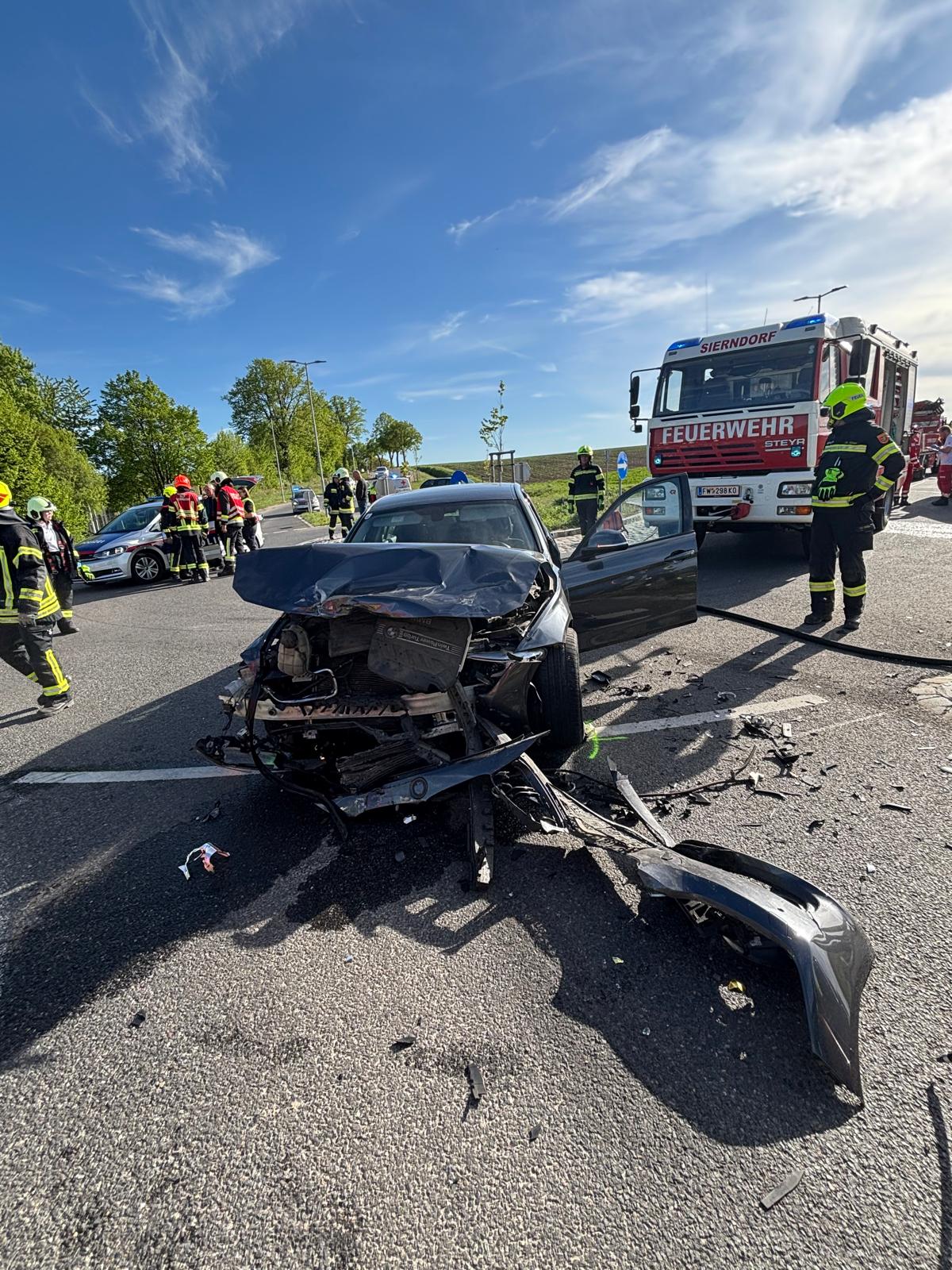Nach Abschluss der Unfallaufnahme durch die Polizei wurde der BMW vom VF-K der FF Leitzersdorf, der VW mit dem WLFA-K der FF Sierndorf verladen und abtransportiert.