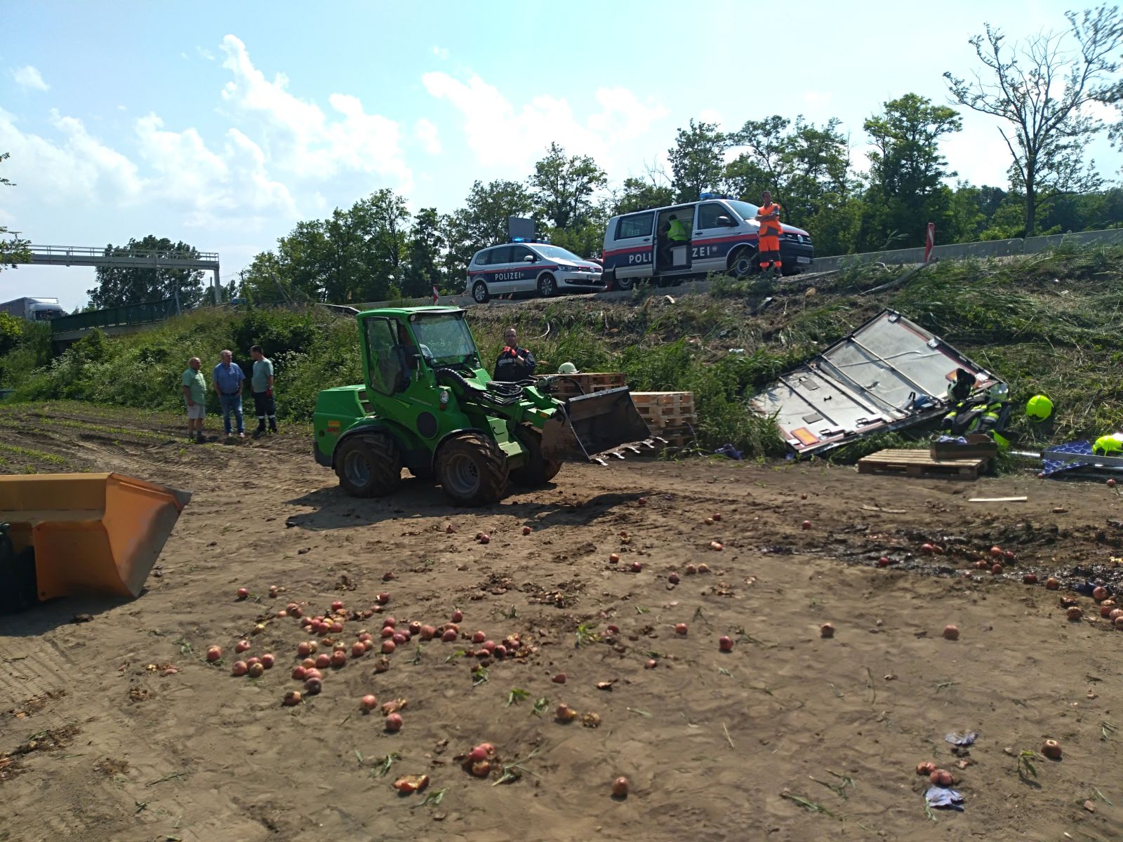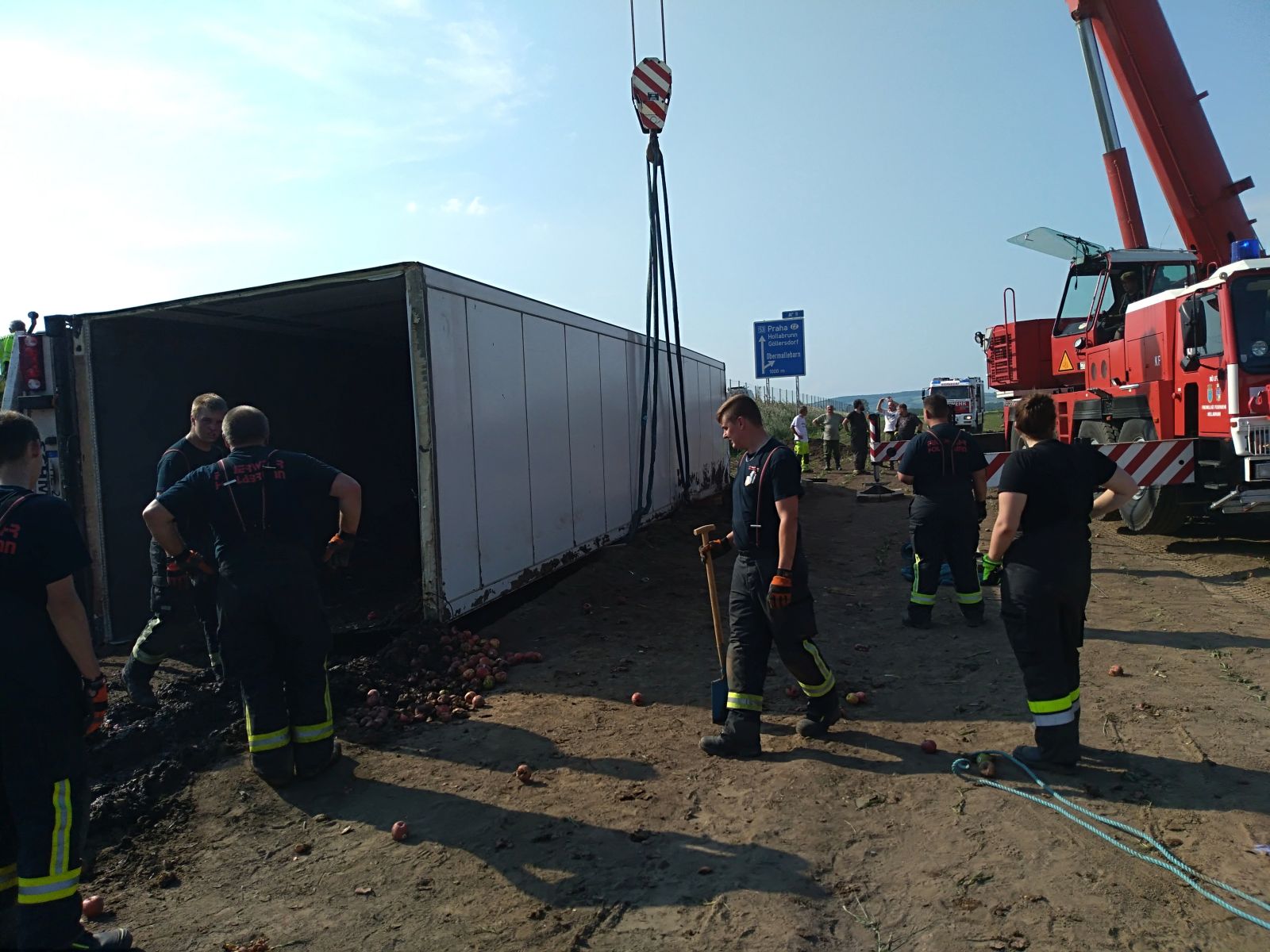 Ein voll mit Äpfel beladener Sattelschlepper war aus unbekannter Ursache über den Fahrbahnrand hinaus gekommen, über die Böschung gestürzt und schließlich im angrenzenden Feld seitlich zum Liegen gekommen.