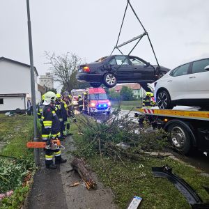 Ein PKW ist aus uns unbekannten Gründen von der Fahrbahn abgekommen, hat zwei kleinere Bäume entwurzelt und ist gegen einen Gartenzaun geprallt. Nachdem bereits ein Abschleppunternehmen das Fahrzeug geborgen hatte bestand unsere Aufgabe darin die Bäume von der Fahrbahn und dem Gehweg zu entfernen.