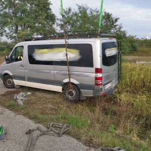 Ein PKW kam bei einem Wendemanöver mit den Hinterrädern zu weit auf unbefestigten Boden, sodass er mit dem Unterboden aufsaß. Mit dem WLFA-Kran wurde das Fahrzeug angehoben und so schonend wieder auf die Straße gehoben.