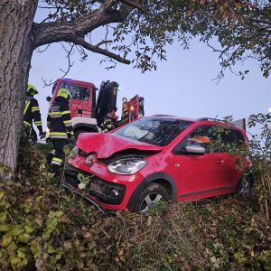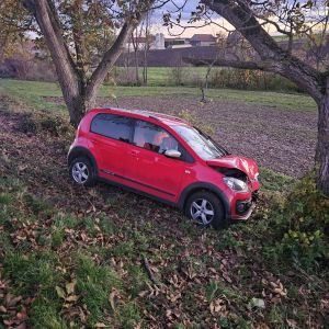 Ein PKW ist aus unbekannter Ursache von der Fahrbahn abgekommen, über die Böschung gerutscht und leicht gegen einen Baum geprallt.