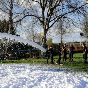 Eine Woche nach dem Wissenstest überlegten wir uns für die Feuerwehrjugendmitglieder eine kleine Überraschung. Nachdem wir alle umgezogen waren, eine Löschleitung vom RLF mit Versorgung durch den Hydranten und die notwendigen Geräte für den Löschangriff mit Schaummittel bereitstanden, wussten bereits alle was passieren würde.