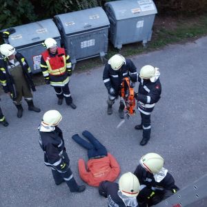 Bei der Übung auf der Kläranlage waren mehrere Stationen vorbereitet. Es galt eine verletzte Person aus dem 1.Stock gesichert mit einem Rettungsgurt über die Schiebeleiter zu retten. Im Keller des Gebäudes galt es eine vermisste Person nach einem Stromausfall zu finden und als drittes Szenario war eine bewußtlose Person aus einem Schacht zu retten.