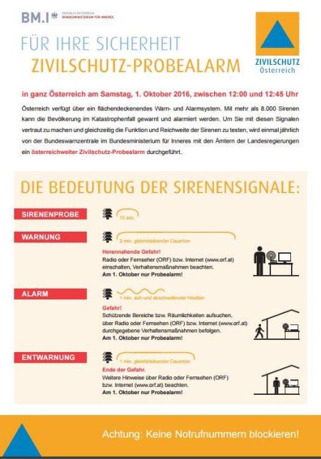 Am 1. Oktober 2016 um 12:00 Uhr findet wieder in ganz Österreich der jährliche Zivilschutz-Probealarm statt.